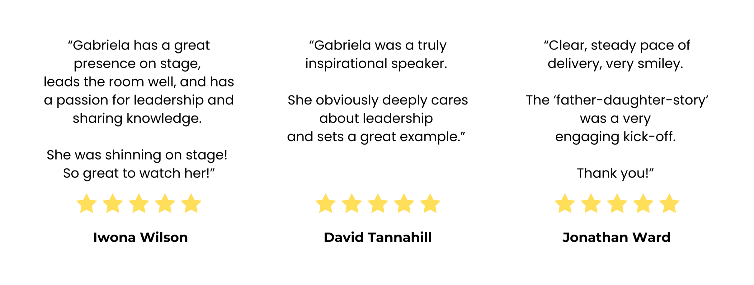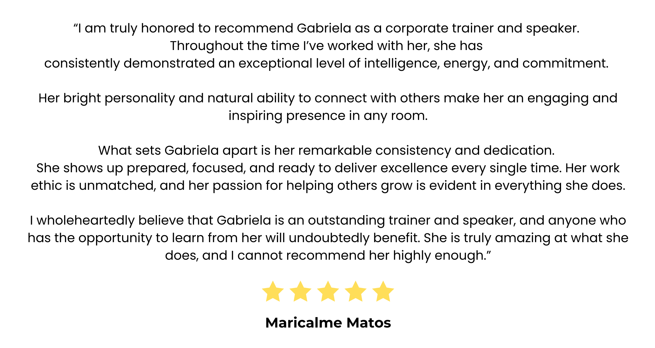 Your organization can benefit from the extensive value that Gabriela brings through her insightful and inspiring Keynote Presentations, Seminars, and Workshops.Â